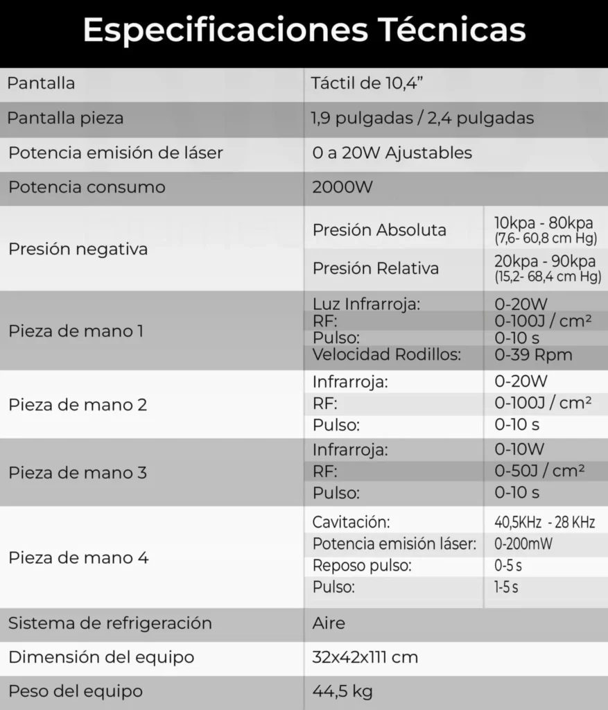 Este dispositivo reúne seis tecnologías en un solo equipo —radiofrecuencia, infrarrojo, masaje mecánico, endermología, cavitación y láser frío— para potenciar los resultados en tratamientos de reducción y moldeamiento corporal.
